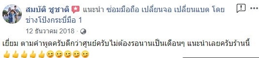 ก็เพราะช่างโป้งจะทำให้คุณอุ่นใจไม่ต้องกังวล เมื่อเครื่องอยู่ที่ช่างโป้ง ลูกค้าสบายใจได้เลย เอาเวลาไปใช้ชีวิตให้มีความสุขดีกว่า ปัญหาต่างๆช่างโป้งจัดการให้ มั่นใจได้ด้วยประสบการณ์กว่า 15 ปี ลอกกระจก, เปลี่ยนจอ มามากกว่า 5000 จอ และมีความเชี่ยวชาญจนเคยออกรายการกระบี่มือหนึ่ง ตอนช่างซ่อมมือถือขั้นเทพ ทางช่อง 7 สี 30 พ.ค. 59